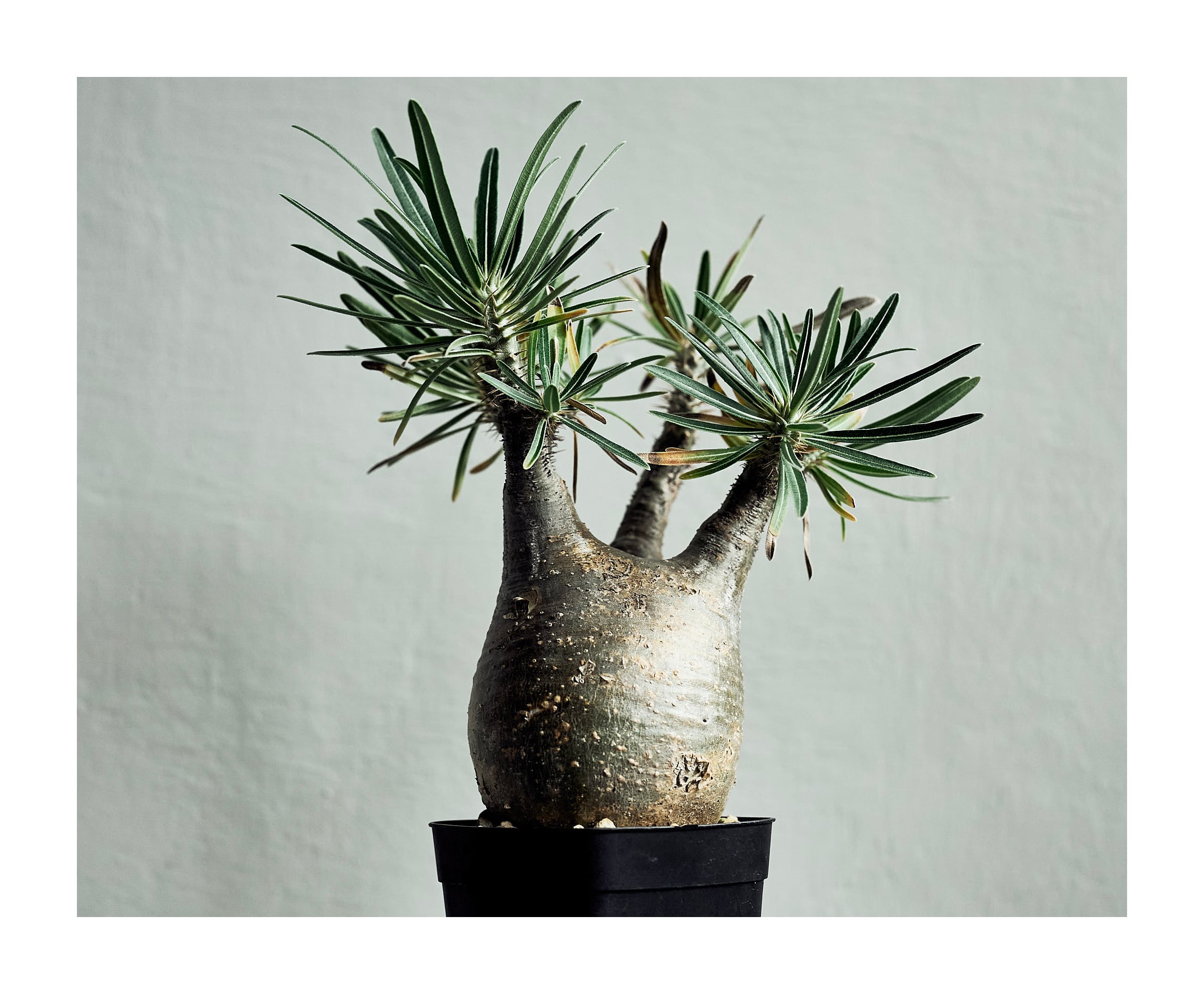 夏が成長期の塊根植物です。年間平均最高気温が30度を超えるマダガスカルのイサロ地区が原産で、ボール状の幹から細い枝が分かれ先端に葉を付かせます。