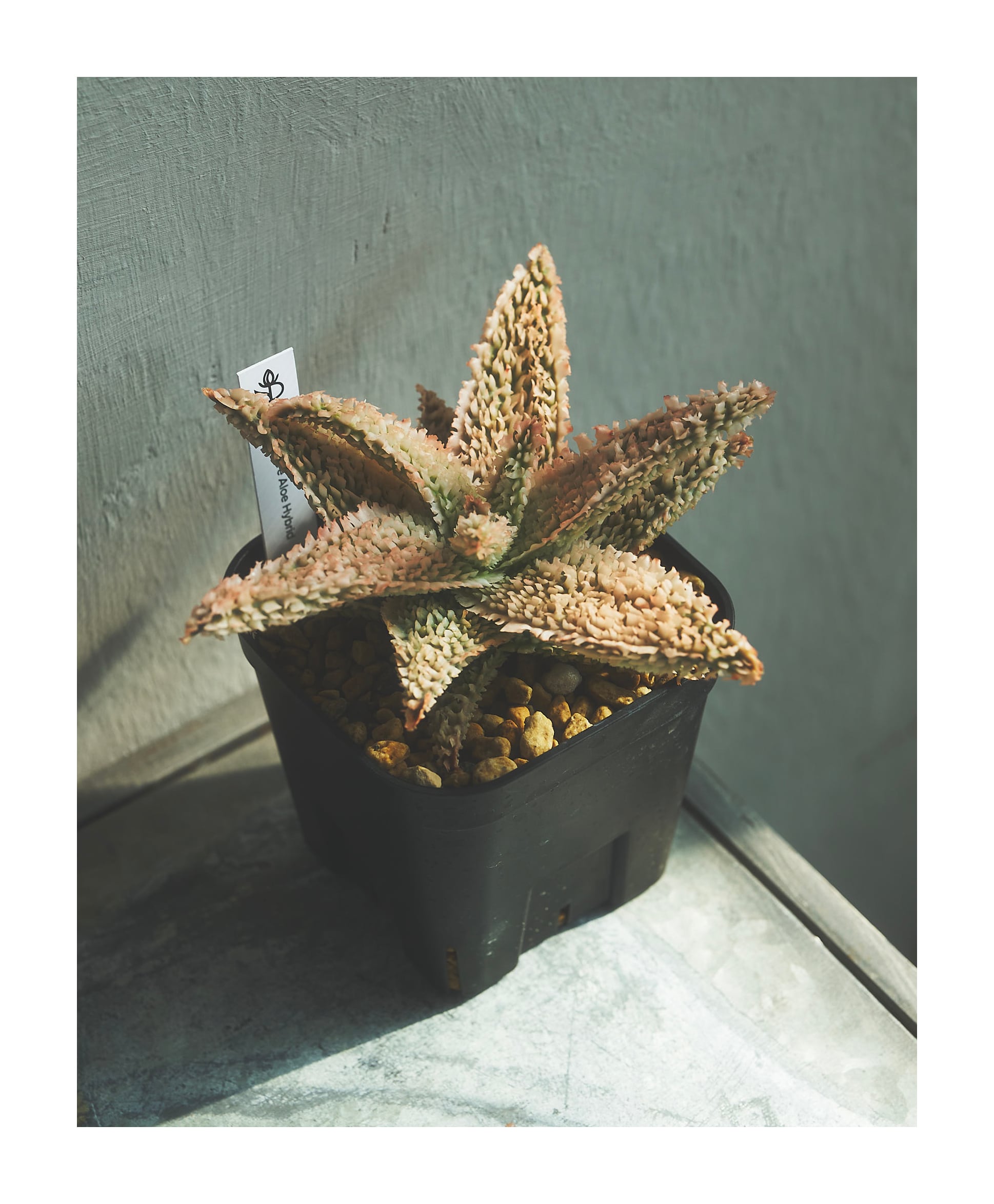 アロエハイブリッドは通常、明るい場所を好みます。しかし直射日光に長時間さらすと葉焼けの原因にもなりますので半日陰くらいが適していると考えられます。そしてアロエの色が赤系の場合は光に当てることで色が強く出る場合がありますが、薄緑系の場合は強い光に弱く葉が焼けやすいです。アロエの生育する環境に合わせて場所や水やりは変わるため、個体の様子を見ながら調整されるのがいいでしょう。